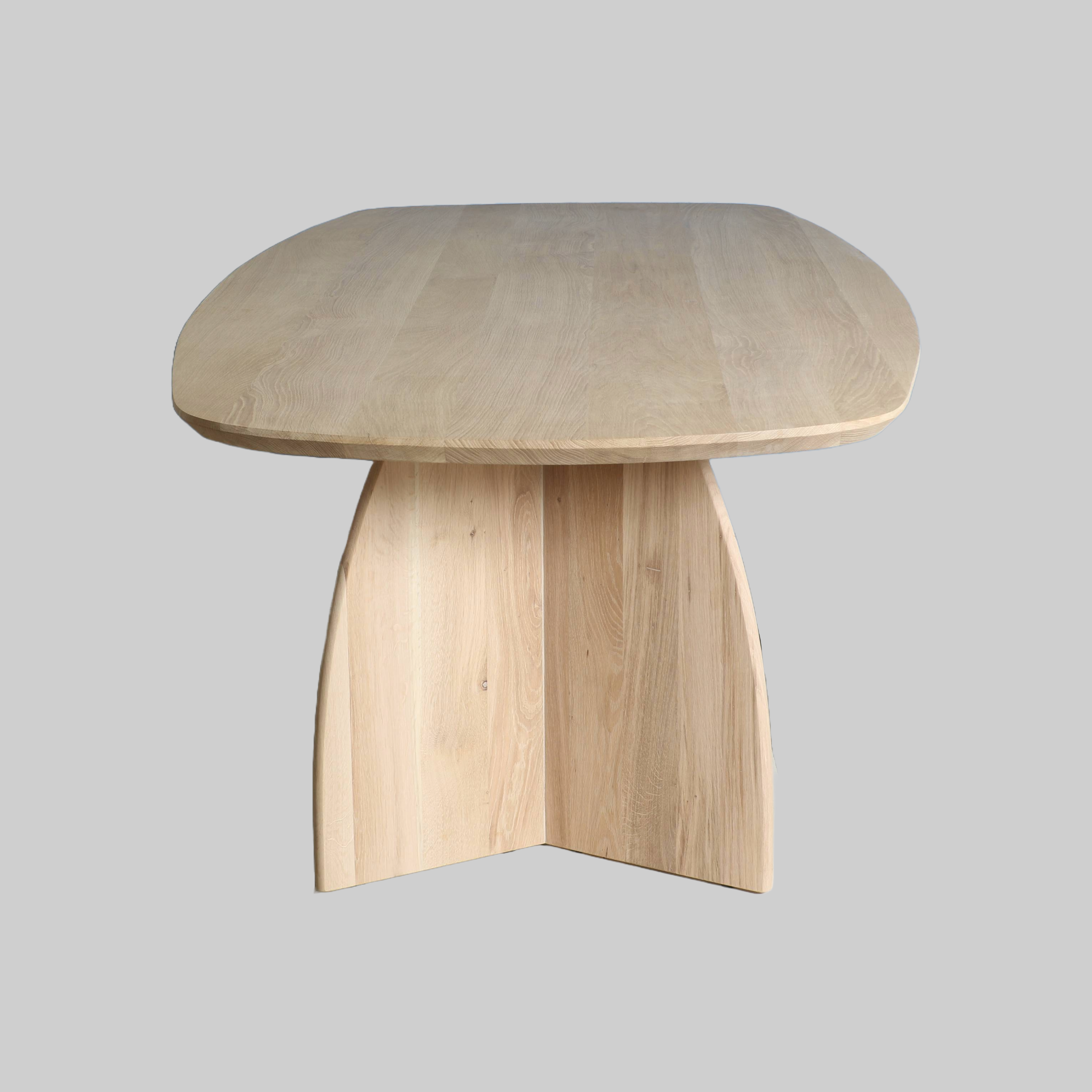 Een stijlvolle eettafel van eikenhout met een Deens ovale vorm. De zachte rondingen zorgen voor een vriendelijke uitstraling, terwijl het 4 cm dikke blad stevigheid en klasse uitstraalt. Deze tafel past zowel in moderne interieurs als landelijke woningen en vormt het hart van ieder etentje.