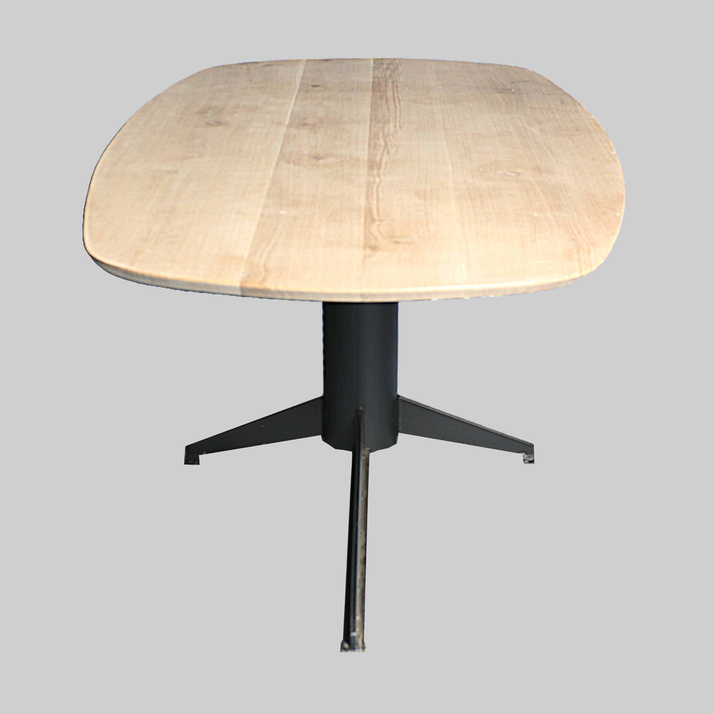 Deze tonvormige eettafel van eikenhout heeft een speels design met een elegante facetrand. De subtiele ronding van het blad geeft de tafel een zachte, uitnodigende vorm. Gemaakt van hoogwaardig eikenhout met natuurlijke nerf en warme tinten – ideaal voor lange diners in stijl.