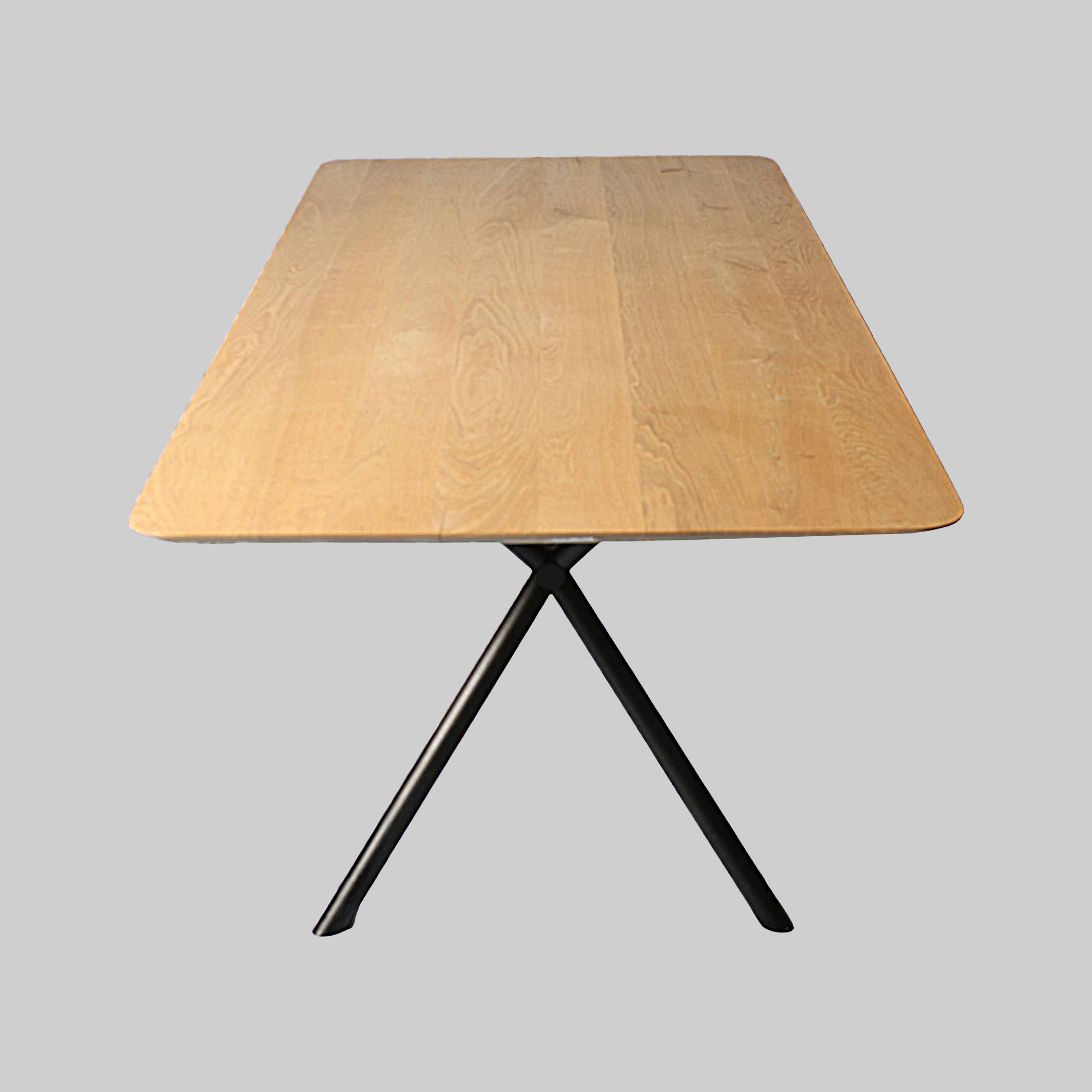 Een eikenhouten tafel met subtiele facetrand die verfijning toevoegt aan het robuuste design. Het blad van 4 cm dik is stevig en strak afgewerkt. De natuurlijke kleur van het eikenhout straalt rust en duurzaamheid uit, perfect voor een sfeervolle eetkamer.