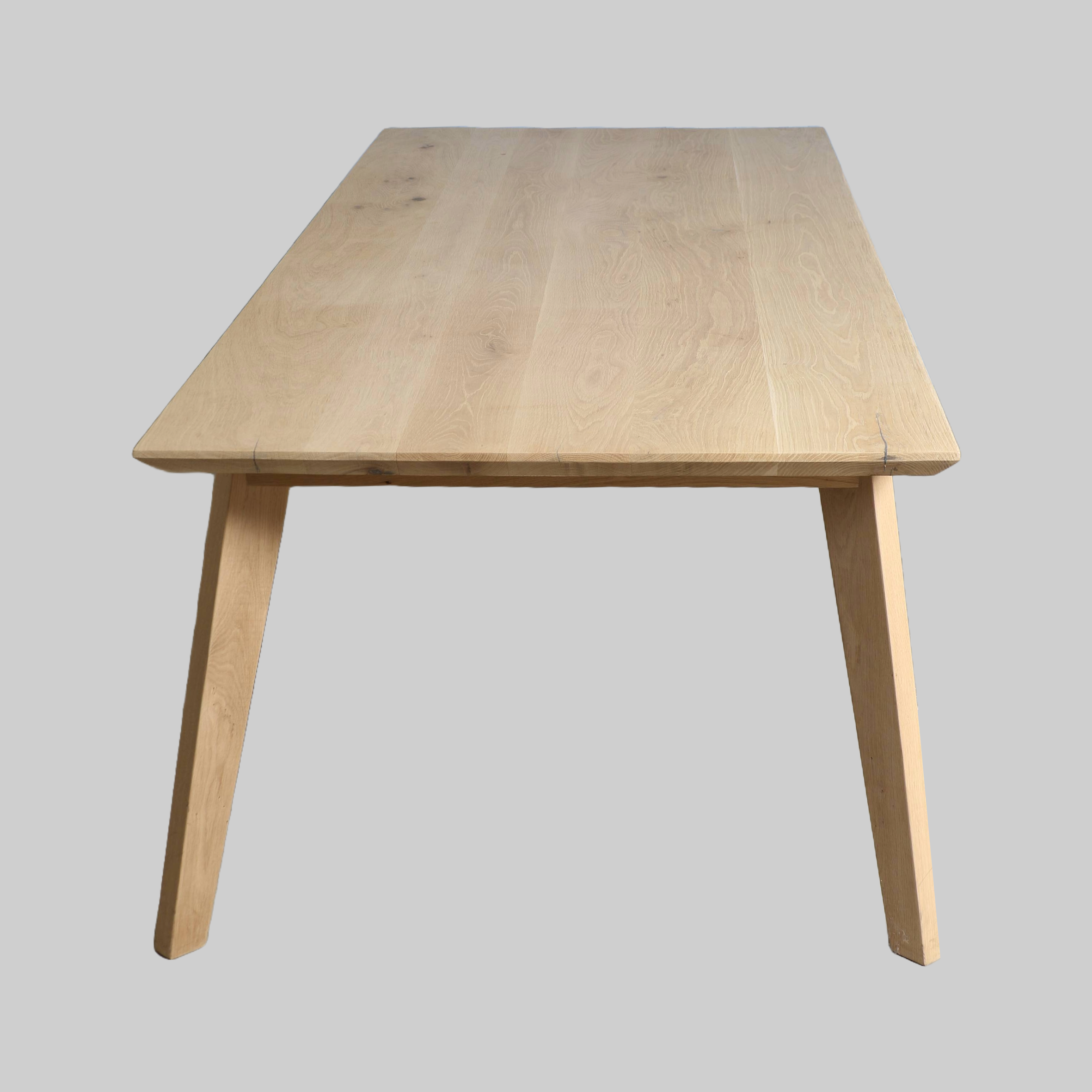 Een verfijnde eettafel van eikenhout met subtiele facetrand. Het 4 cm dikke blad en de natuurlijke nerftekening zorgen voor een elegante, rustige uitstraling. Deze tafel combineert ambacht met eigentijds design, perfect voor moderne en landelijke settings.