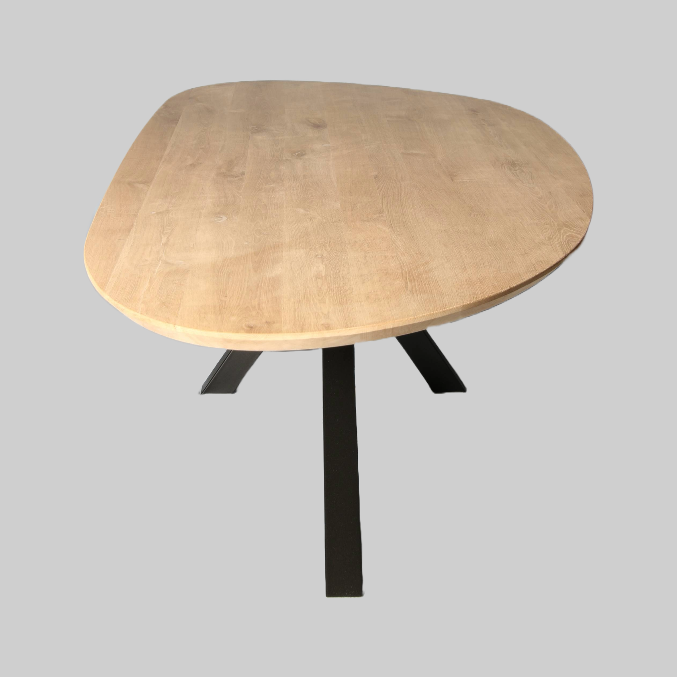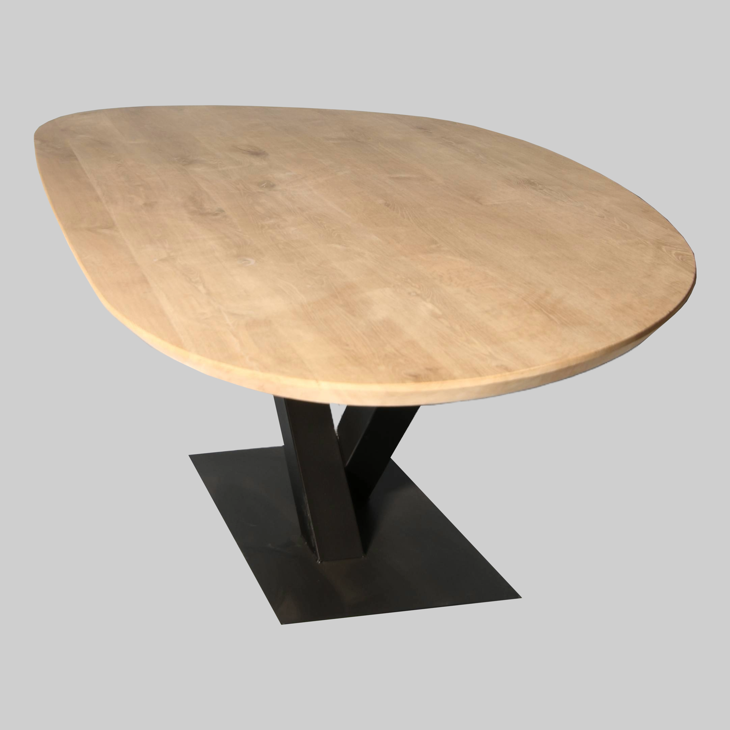 De eiken eettafel Nier heeft een speelse, asymmetrische vorm die direct opvalt. Het 4 cm dikke blad van massief eikenhout laat de natuurlijke nerftekening prachtig uitkomen. Dankzij de vloeiende lijnen oogt de tafel licht en uitnodigend — ideaal voor interieurs die warmte en originaliteit combineren.